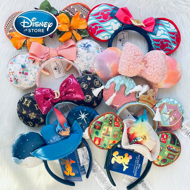 2024 Original Disney Mickey Ears Headband Shanghai Disneyland Minnie Leather Headband Hairband Sequin Bow Party Hair Accessories